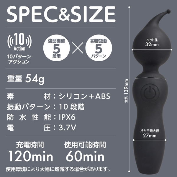 コンパクトで使いやすいピンポイント刺激が可能なデンマです♪先端はピンポイント刺激に特化した形状を採用し、心地よい肌触りと柔らかさにこだわったオールシリコンボディが特徴!5段階の強弱調整と5パターンのアクションを組み合わせた10パターン振動が楽しめます♪軽量で疲れにくいので、長時間の使用も快適!IPX6の高レベル防水性能を備えており、しっかり洗えて衛生的に使える便利なアイテムです♪
