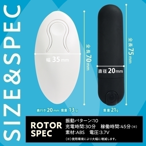 仕様:パッケージ:ヘッダー14.5×8.8×3.0cm ローター 7.5×直径2.0cm リモコン 7.0×3.5×2.0cm USB充電式