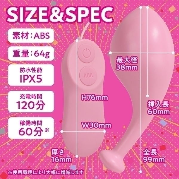 仕様:本体サイズ:コントローラー:3.0×7.6×1.6cm ローター:全長9.9cm×挿入長6.0cm 最大径3.8cm 重量:64g USB充電ケーブル USB充電式