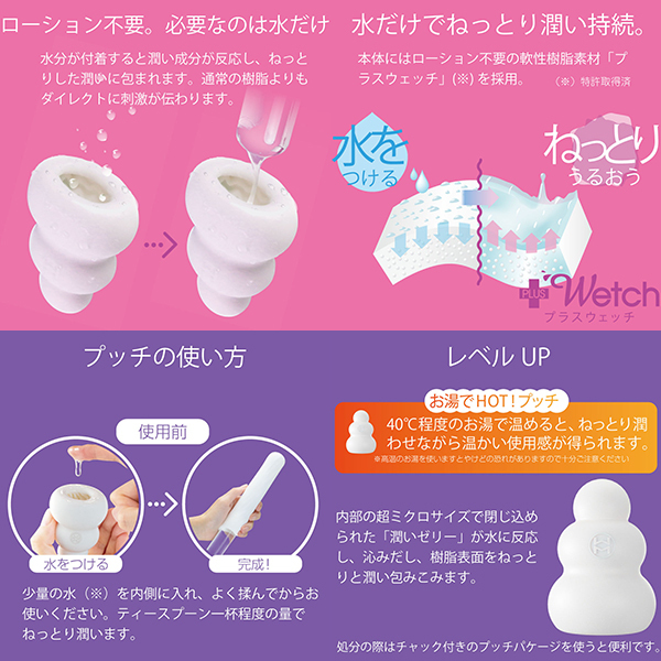 全てが新しくなったプッチ。ポケットサイズのローション不要ホールプッチシリーズが生まれ変わって新登場。軟性素材から内部の構造、パッケージ、全てが新しくなりました。デコボコ感、さらにクッキリ。今回新たに導入した「HD(High Definition)成形」で突起のデコボコ感がさらにクッキリになりました。突起に触れたときの粒立ちが違います。弾力感、さらにモッチリ。「HD 成形」により軟性樹脂の弾力性も向上。さらにモッチモチに、しなやかな素材になりました。内部構造も、さらにハッキリ。オリジナルシリーズ、スイーツシリーズ計8種類の内部構造をより精密な造形にリニューアル。「HD 成形」とあいまってデコボコ感がよりハッキリわかる構造になりました。生産工場を一新。新型プッチシリーズは日本国内に新設した工場から生産。最新の設備と厳密な品質管理で一つ一つ丁寧に作ります。ローション不要、必要なのは水だけ。ローション不要軟性素材「プラスウェッチ」水分が付着すると潤い成分が反応、ねっとりした潤いに包まれます。<ウェーブ内部構造>「連続で打ち寄せる快感の波」ウェーブ状のヒダが絶え間なく打ち寄せる快感の波をもたらす