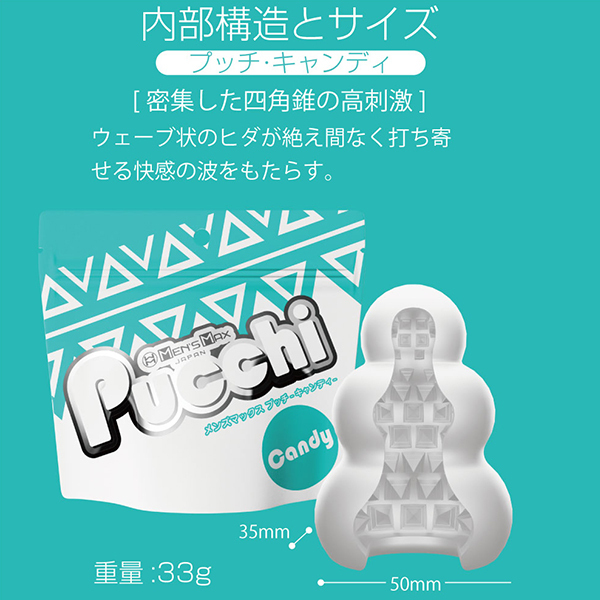 全てが新しくなったプッチ。ポケットサイズのローション不要ホールプッチシリーズが生まれ変わって新登場。軟性素材から内部の構造、パッケージ、全てが新しくなりました。デコボコ感、さらにクッキリ。今回新たに導入した「HD(High Definition)成形」で突起のデコボコ感がさらにクッキリになりました。突起に触れたときの粒立ちが違います。弾力感、さらにモッチリ。「HD 成形」により軟性樹脂の弾力性も向上。さらにモッチモチに、しなやかな素材になりました。内部構造も、さらにハッキリ。オリジナルシリーズ、スイーツシリーズ計8種類の内部構造をより精密な造形にリニューアル。「HD 成形」とあいまってデコボコ感がよりハッキリわかる構造になりました。生産工場を一新。新型プッチシリーズは日本国内に新設した工場から生産。最新の設備と厳密な品質管理で一つ一つ丁寧に作ります。ローション不要、必要なのは水だけ。ローション不要軟性素材「プラスウェッチ」水分が付着すると潤い成分が反応、ねっとりした潤いに包まれます。<キャンディー内部構造>「密集した四角錐の高刺激」整然と敷き詰められた四角錘の突起