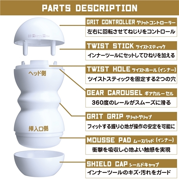 グリットコントローラーは右にも左にもツイスト可能。右と左のひねる方向で内部構造も変化する!お好みのひねり具合で吸着感をコントロール!挿入口のキャップを外しローションを入れて挿入。グリットコントローラーを右に左にねじって刺激の変化を体感せよ。インナーは丸洗い可能。各パーツを取り外し、洗浄・乾燥が終わったら組立てて再び使用可能。アウターケースは耐久性に優れ表面のマット仕上げとフォルムで安心のグリップ感。インナーは約250gで単体のみでの使用も可能なずっしりサイズ。ポケットローション(7ml)付属。グリットコントローラーに付いたスプリングボールとギアカルーセルがかみ合いスムーズな操作性を実現。グリットコントローラーは右にも左にも回せます、右と左のひねる方向で内部構造も変化する!お好みのひねり具合で吸着感をコントロール!<内部構造>@グラインドスクリュー 掘削機をモチーフにした最奥ゾーンAツインスクリュー 2種類の縦型スクリューで締め上げるBビッグスクリュー 肉厚なスクリューが根本をホールド