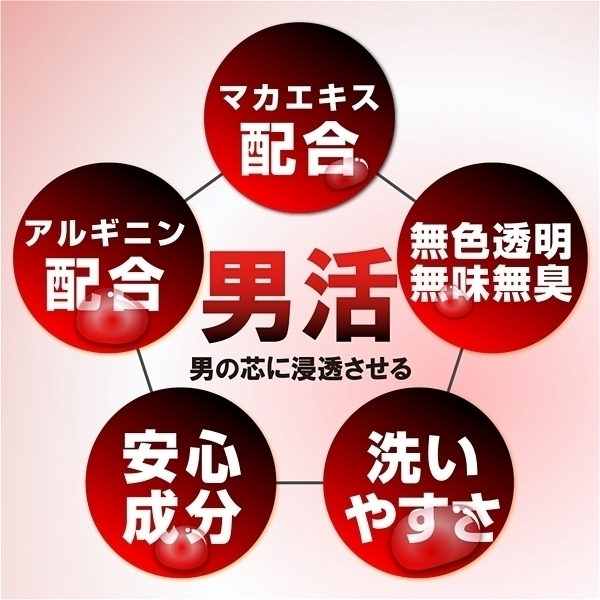 パワー不足を補う効果に期待の持てる成分をふんだんに配合した、男の自信活性化ローション男性の活力を助ける効果が期待できるローションです。マカ・シトルリン・アルギニン等、男性機能改善・性欲向上・血流向上・滋養強壮等に期待の持てる成分を配合し、エキサイティングな夜の生活を助けます。様々な用途に適した中高粘度なので、セルフプレイからカップルでの使用まで広く対応可能です。水で簡単に流せるので、使用後の手間もかかりません。