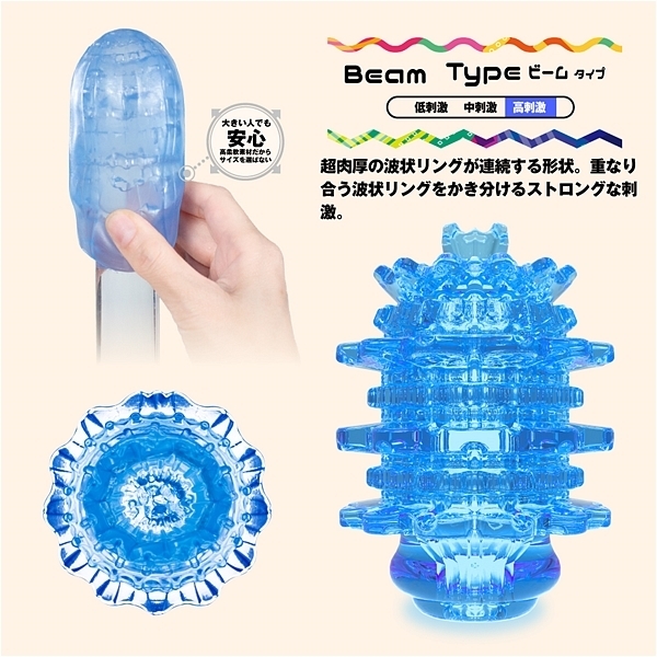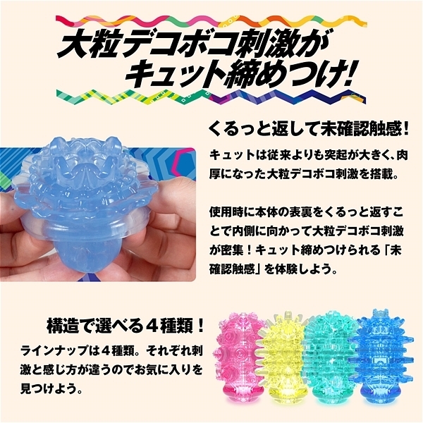 大粒デコボコ刺激がキュット締めつけ!裏返す事で未知なる体験と利便機能を持った変化する密集体ホール。「Qutto−キュット−」は従来よりも突起が大きく、肉厚になった大粒のデコボコ刺激を搭載。使用時に本体の凹凸面を内側に返すことで、内側に向かって大粒のデコボコ刺激が密集。キュット締めつけることで、「未確認の触感」を体験することができます。ビームタイプは、超肉厚の波状リングが連続する形状。重なり合う波状リングをかき分けるストロングな刺激。この商品には個装のローションが付属しています。