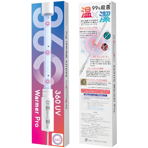 メンズマックス 360UVウォーマープロ。3分で急速加熱、UVランプで360°殺菌、20センチのロングサイズ、乾燥に便利な吸水ソフト、ティック付属、USBケーブル長さ1m。99.9%除菌、除菌に最も効果的な波長275nmのUVC紫外線ランプを6個搭載し、USB電源を入れるだけで99.9%除菌ができる。気になるウイルスや、細菌をしっかり除菌してくれて、お気に入りのホール内を360度清潔に保てます。■使い方手順@本体キャップを外すAウォーマーをホールにセットするBUSB電源をセットして加熱と、除菌を開始します<ロングサイズ>本体サイズは20cmで大型ホールの使用も安心です<液体に強い 生活防水仕様>材質はABS・ガラスなので安心の生活防水仕様。丸洗いができるので清潔に使用できます。<ウォーマー機能>加熱時間およそ5分で約55度まで上がり加熱完了。※USB部分は非防水です。