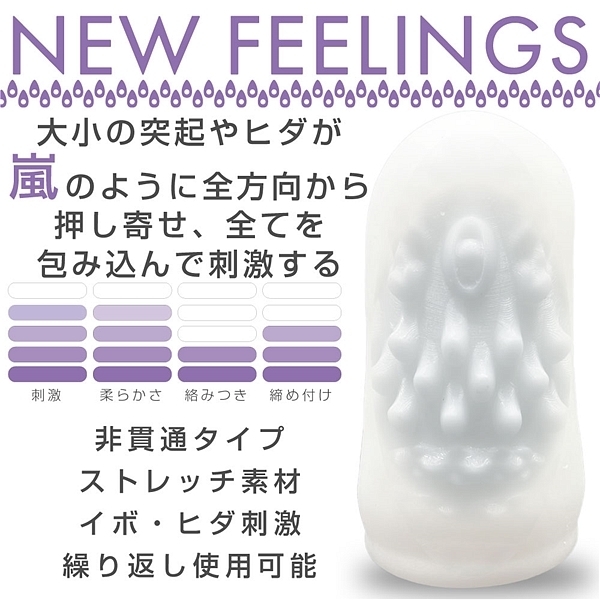 コンパクトでも実用的で繰り返し使えるミニホール。全方向からせり上がるイボが嵐の様に刺激。コンパクトで持ち歩きに便利なミニホール。STORMは360度全方向から斜めにせりだしたイボが怒涛の刺激を生み出します。また最奥は大きな突起を配置し、先端にグリグリひっかかる快感を楽しめます。さらに耐久性も高く、繰り返し使用可能。容器はホールを立てられるタイプなので、洗ってからの乾燥や保管にも便利です。NEW FEELINGS PALM CAPSULE04 STORM(ストーム)