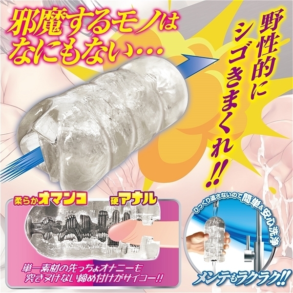 肉厚透明素材がググっと締め付ける!ソフト素材とハード素材のシームレス貫通ホール。中まですけすけのクリア素材を採用した丸見え貫通ホール。膣側の入口はソフト素材、お尻側の入口はハード素材を使用し、シームレスな硬さの変化を楽しめます。内部構造はヒダや突起を複雑に配置。四方八方から締め付けとゾリゾリ刺激を生み出します。寸胴ボディなので肉厚感を存分に楽しめるとともに、貫通型ならではの開放感と先端刺激も味わえる贅沢仕様のホールです。