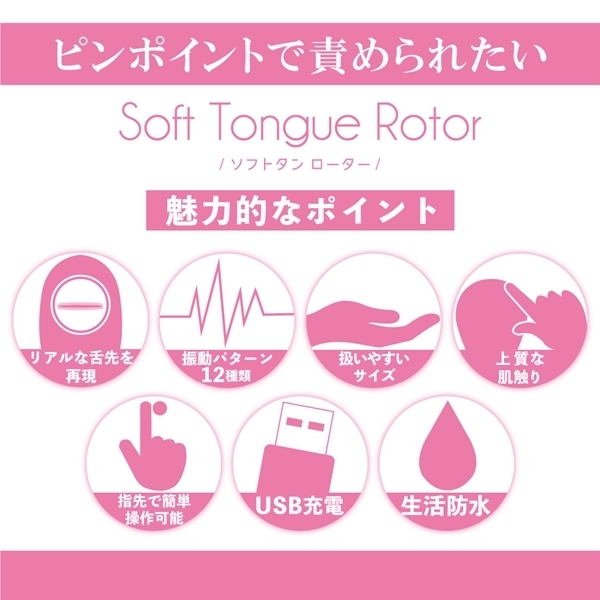 柔らかい舌が高速で振動する舌型ローター。12種類の振動パターンで絶頂まで導きます。MOTLABに女性向けグッズブランド、ハートラインが誕生。Soft Tongue Rotorは柔かな舌で高速に舐められるような刺激を体感できます。振動パターンは全12種類。超高速の縦振動を実現しました。舌先はソフト素材を採用しており、体に優しい柔らかい刺激を楽しめます。また直感的でシンプルな操作が可能で、プレイ中の雰囲気を壊しません。持ち運びにも便利な上、充電式なので使う場所を選びません。生活防水なので安心して使え、使用後は洗浄し清潔に保てます。