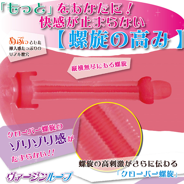 「螺旋の高み」を追求!快感がとまらないオナホール「ヴァージンループ」非貫通型。高弾力素材のバンジータッチを採用!挿入してすぐに始まる縦横無尽の螺旋形状で、ゾリゾリ刺激を体感!四葉のクローバーに見える縦ヒダが奥まで続く構造、この縦ヒダにひねりをプラス!縦ヒダの隙間には、絶え間なくヒダ溝が続いています。ローションポケット採用でローション乾きも防止!先から裏スジまで、容赦なく刺激してくれるオナホールです。※製造時期によりパッケージのデザインが異なる場合が御座います。