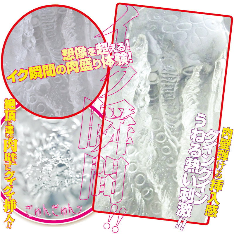 その名の通り、イク瞬間のアソコを再現した非貫通型オナホール「イク瞬間まんぴースパイラル」。ホール特有のストレス臭をカットしたクリア素材を採用し、筋肉のこわばりによりギュッと締まった膣内をイメージ!弾けるような高弾力で、ねじれながらバキュームする極上のスパイラル構造。まさに絶頂の一瞬を体感できるオナホールです。