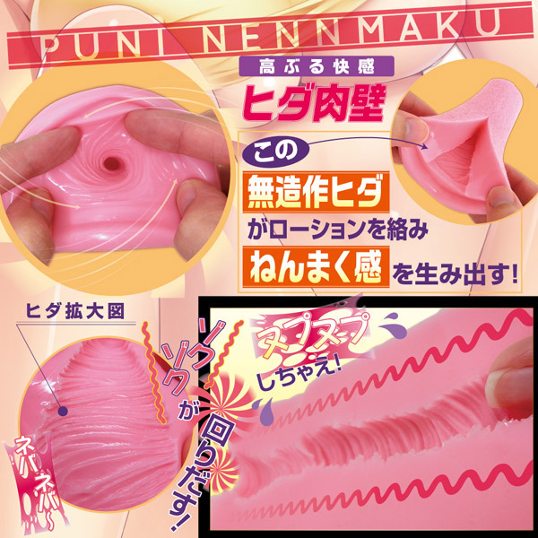 ネバネバが気持ちいいナマ感触!ぷにぷにのヒダ肉壁が渦巻く粘膜系オナホール「ぷにねんまく」。●バンジータッチ素材使用●高弾力なむっちりボディ●ネバネバ快感のヒダ肉壁●無造作ヒダが生む粘膜感●洗いやすく清潔な貫通型。ヌプヌプの「ねんまく」感に特化!ねっとりとペニスに絡みつく粘膜テイストが気持ちいいヒダ系オナホールです。