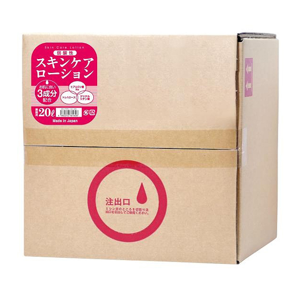 敏感肌や女性に嬉しい弱酸性のスキンケアローション20L。ヒアルロン酸やトレハロース、グリチルリチン酸といった3種類の保湿成分を配合!レジャー施設や風俗店に最適な大容量サイズ。詰め替え用としてもお使いいただけます♪※大型商品の為、送料が別途必要になります
