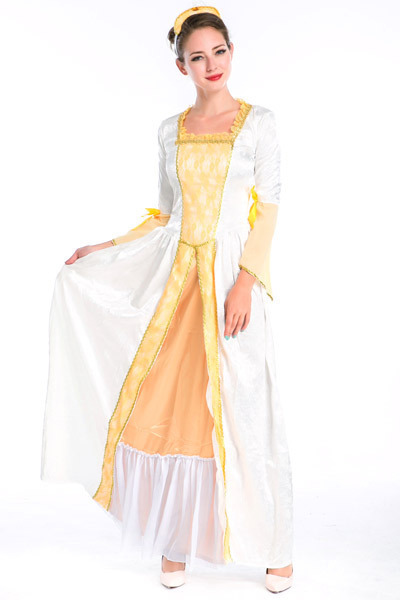 品のあるレースが優雅に舞うルネッサンス調のドレスコスチューム。ホワイトカラーをベースにイエローカラーを組み合わせたふんわりと柔らかな印象のロングワンピースは、上品にフリルが囲うスクエアネックデザイン!スカート部分は重ね着風のレイヤードスタイルでゴージャスに!フレアなラッフルスリーブにはリボンを添えて可愛らしさもしっかり♪ビジュー付きのカチューシャもセットです。※セット内容以外は付属しておりません。