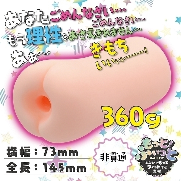 もしも隣の奥さんがエロい恰好で誘ってきたら…誰もが妄想する夢のシチュエーションホール!すれ違う度に言い寄ってくる隣の奥さんにもう我慢ならん!うねうね絡みつく肉ヒダパイプを抜けると、不規則なゾリゾリヒダに擦られ悶絶!仕上げには一番奥のザラザラ肉ヒダが先端をグリグリ刺激して発射を促します。360gの本体はその肉厚でググっと締め付け、密着度も包容感もたっぷりです。適度な弾力と密着感の独自素材「もっとふぃっと」を採用しています。