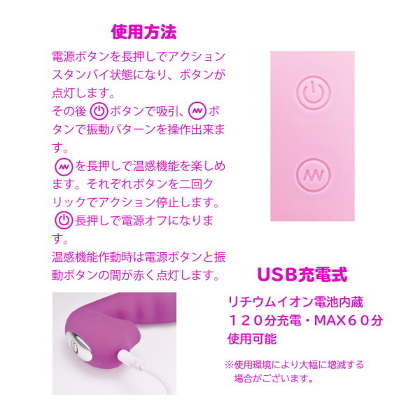 SNSで話題の<吸うやつ>吸引しながら振動を楽しめるくの字形状に温感機能搭載でリアリティUP!振動部分の形状や太さにもしっかりと拘った納得のアイテムです。しかもIPX7の完全防水性能設計だからしっかり洗えて水場での使用も問題ありません。120分充電で最大60分使用可能●カラー:パープル