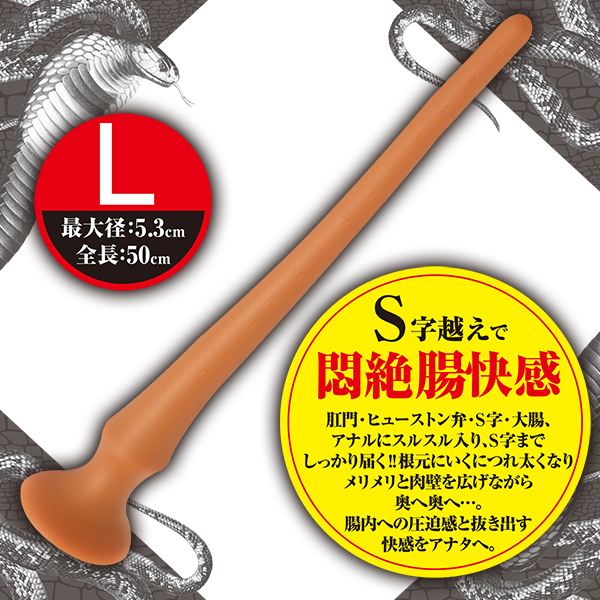 柔らかくて伸縮性のあるソフトシリコン素材を使った「ロングコロンスネークプラグ」です。こちらはLサイズで太さはそれ程でもなく、全長50cmで最大径5.3cm!S字や大腸までしっかり届き、アナルにスルスルと入る仕様でエキスパートだけが味わえる気絶しそうなほどの悶絶快感もしっかりと味わえます♪根元にいくに連れてどんどん太くなるデザイン。メリメリと肉壁を広げながら奥へと進み、腸内にディルドが収まり腹部がいっぱいになる感覚を堪能したり、抜き出す悶絶快感をお楽しみ頂けます♪腸内を傷つけない柔らかいリキッドシリコン製でモチモチとした滑らかな触感が気持ちいい!底部には吸盤もついているのでいろんな体勢で挿入プレイをお楽しみ頂けます!