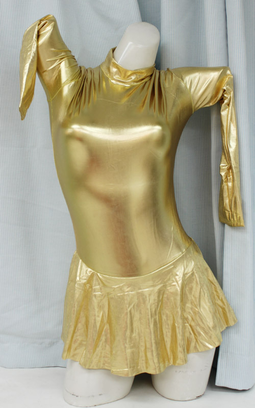 まるでフィギュアスケーターのような、スカート付きの長袖レオタード(BIG)。エナメル製のように光沢のある、キラリと輝くゴージャスなゴールドカラー!伸縮性があるので、ピッチリとしたバストやクビレが美しいボディラインを引き立てます!ひらりと軽いスカートから覗く、ハイレグとヒップラインがとってもセクシーなコスチューム!背中のファスナーで脱着衣が可能です。※水洗い可、塩素系漂白剤による漂白不可、ドライクリーニング可、色落ちの可能性があります。※こちらの商品は在庫の状況によりお届けまでに4日〜7日程度かかる場合がございます。
