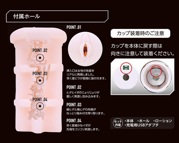 仕様:パッケージ:29.2×20.5×11.5cm 本体:25.0×8.5cm・ホール全長12.5cm セット内容:本体、ホール、ローション、充電用USBアダプター USB充電式