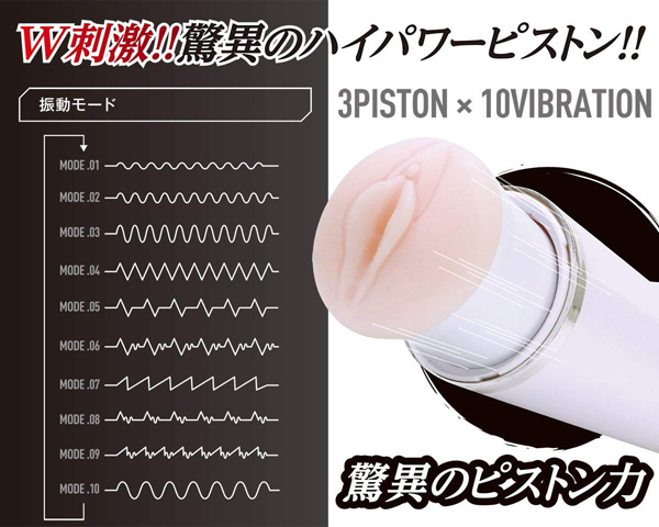 握力いらずで快感に集中できる、驚異のハイパワーを実現したピストンオナホ!ダブルの刺激とハイパワーが自慢のピストンモードを搭載したカップ型の電動オナホは他に類を見ません♪3段階の高速ピストンと10段階もの激振動で、これまでにない未知の快感を体感できます!本体上部の空洞部分には親指を通して固定できるので、握力をさほど使わずに使用可能。付属のホールはリアルな形状で、挿入口付近はヒダとイボのジョリジョリが貴男の息子を優しく刺激♪縦ヒダと横ヒダの肉塊とねっとり絡みつく快感、突く度に先端を襲うイボによるコリコリ刺激がたまりません!ご使用後はホールを取り外して洗浄可能♪電源はUSB充電式で、4時間の充電で約40分の連続使用が可能です。