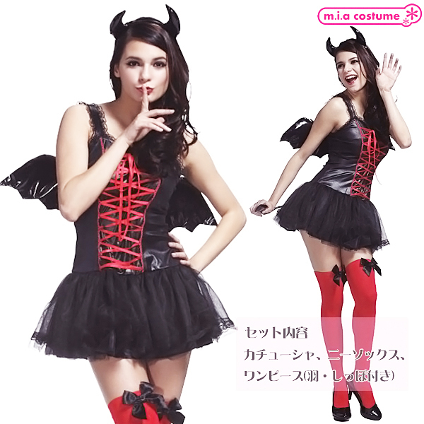 ハロウィンの定番コスプレと言えば悪魔の仮装!羽と尻尾が付いた光沢感の美しい艶やかなエナメル風ワンピースと、角付きカチューシャ、黒いリボンが装飾されたニーソックスのフルコーデセット。フロントの編み上げとボリューム感のあるチュチュが、魅力的な小悪魔に変身させてくれる♪シワになりにくく速乾性に優れたポリエステルを100%使用。※水洗い不可、塩素系漂白剤、アイロン、ドライクリーニング不可、色落ちの可能性があります。※こちらの商品は在庫の状況によりお届けまでに4日〜7日程度かかる場合がございます。