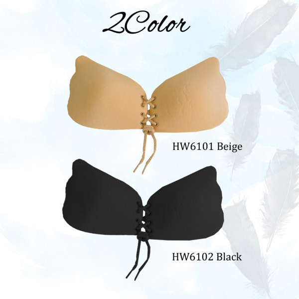 寄せて上げて谷間もメイク♪天使の羽型シリコンブラ「フェザーアップブラ ブラックB」。羽のようなカップがボディに馴染みやすいブラックカラーのモールドブラ!カップ内側は粘着シリコン樹脂、外側はサラリとした肌触りのポリエステル素材です。中央はアジャスターで自在に調整できる編み上げ仕様!胸のボリュームを強調したい場合は少し上目で着用し、紐を持って留め具を上下させるだけで自由に谷間をメイク出来ます。【着用方法】両手でカップを外に向けて反らし、最適な位置にあわせてから外に反ったカップを胸の方向に戻して、ふちが胸につくように指先でなぞって下さい。左右着用後、両手でカップをしっかり押さえて定着させ、留め具をスライドしてお好みで調整して下さい。粘着効果が薄れた際は、一度水洗いし乾燥させてから再度着用して下さい。※サイズは画像を参考にお選びください※通常よりワンサイズ小さめが綺麗に着用できる目安です※Aサイズ(h00036)もございます
