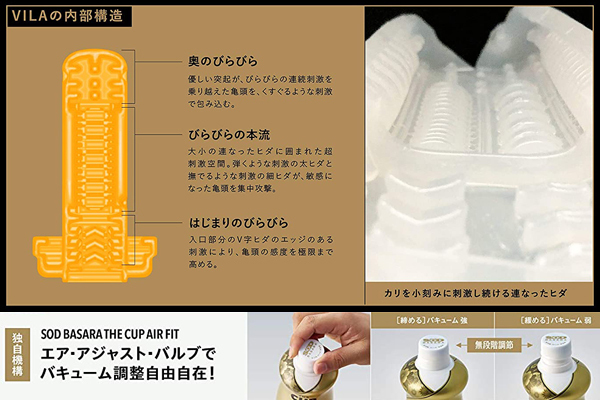 無段階で空気調整ができる画期的なソフト・オン・デマンド新ブランド「SOD BASARA」シリーズ新作!幾重にも連なるビラビラによる刺激が、先端から根元にかけて波のように押し寄せるヒダ特化型構造。バキューム力を調整出来るキャップ式のエアアジャストバルブを自由に開閉することで、自分好みの締め付けや挿入感を楽しめます◎重量156g