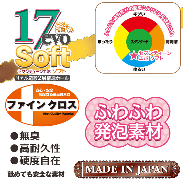 トイズハートの大ヒットオナホール「セブンティーン エヴォリューション」に、ソフトバージョン「17evo Soft(非貫通型)」が登場しました。オリジナルのリアルな2重構造や外観はそのままに、最新の柔らか素材を採用した特別仕様!外側はふわふわ発泡素材、内側はねっとり絡まる粘膜素材でマッタリとした刺激を味わえます!超プレミアオナホールをぜひご堪能ください。※製造時期によりパッケージのデザインが画像と異なる場合が御座いますが中身は同じです。