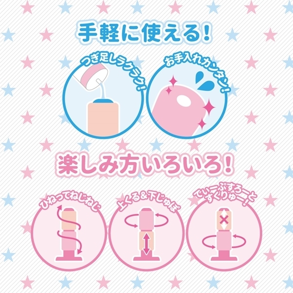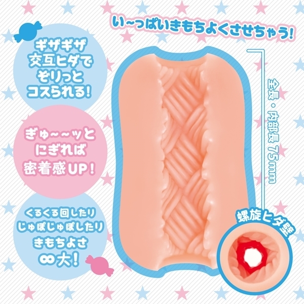 握るほど密着感UP!小悪魔ちっくな表情の可愛い妹パッケージの直径約75mmの小型オナホ(日本製)。ギザギザ交互にぞりっと刺激する螺旋ヒダ構造!一つで使えっても気持ちいい、でも別売りの「にこにこばーじょん(t10580)」を合体させて使えばより気持ちよさ倍増♪回転させたり捻ったり、ランダムな刺激で未知なる快感を体験しよう♪お手入れしやすい貫通式
