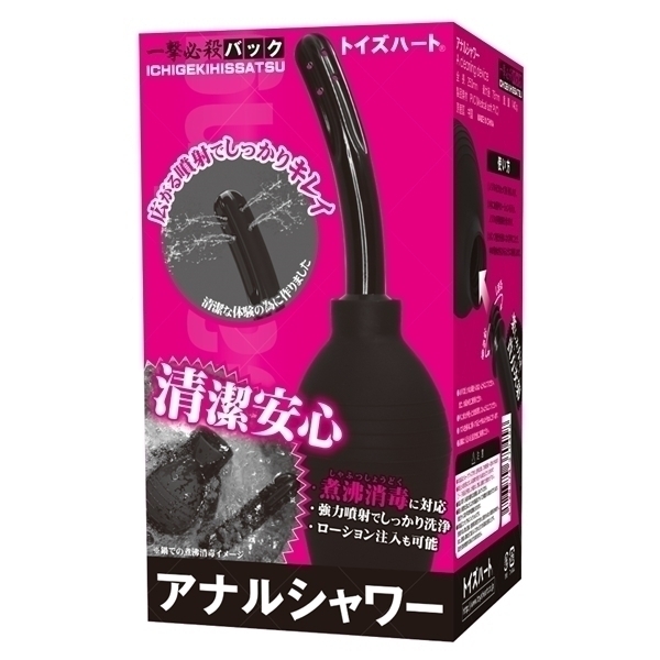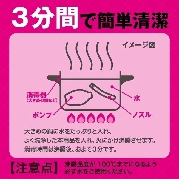 一撃必殺バック。煮沸消毒できるシャワーポンプ。沸騰後、およそ3分で簡単清潔。やわらかロングノズルでしっかり洗浄、広がる噴射口で内部をしっかり洗浄。