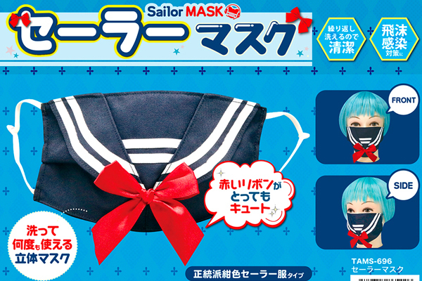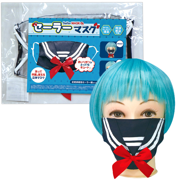 2本の白ラインと真っ赤なリボンが映える!セーラー服をイメージした繰り返し使える可愛い立体マスク。定番の紺色セーラーをそのままマスクにしたようなデザインが特徴!鼻から顎までしっかり覆い隠します。飛沫対策や花粉、風邪予防として、コスプレ衣装のおともに、ビンゴ大会の景品やプチギフトにも最適です◎●メーカー型番:TAMS-696