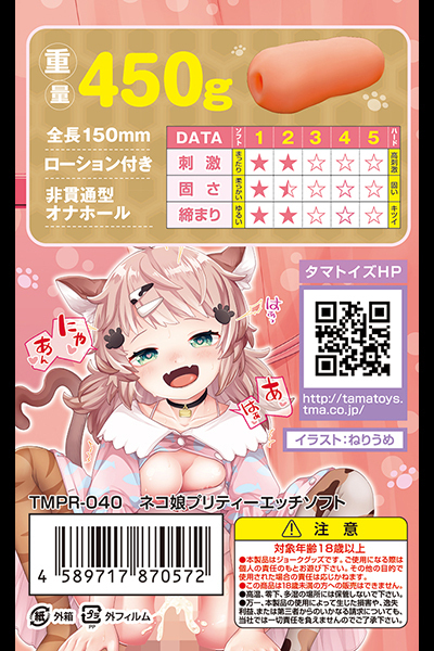 大小山型の突起がさわさわと竿を撫でるゾクゾク感がたまらない!高刺激と思わせながらも心地よい刺激でイカせてくれる非貫通オナホ「ネコ娘プリティーエッチソフト」です♪ネコ娘の甘噛みをコンセプトに開発されたオナホで、タマトイズで人気のヤツメウナギ構造を進化させ、フワトロ系にしたことで大きめのイボのような刺激を実現!アウターはシンプルな筒型で挿入口はポチ穴♪フレキシブルな弾力感のある素材感でサイズ的にミドルサイズ!弾かれるようなフリック構造の内部とびっしり配置された2種類の突起イボが、絡みつくような快感を存分に味わわせてくれます♪●メーカー型番:TMPR-040