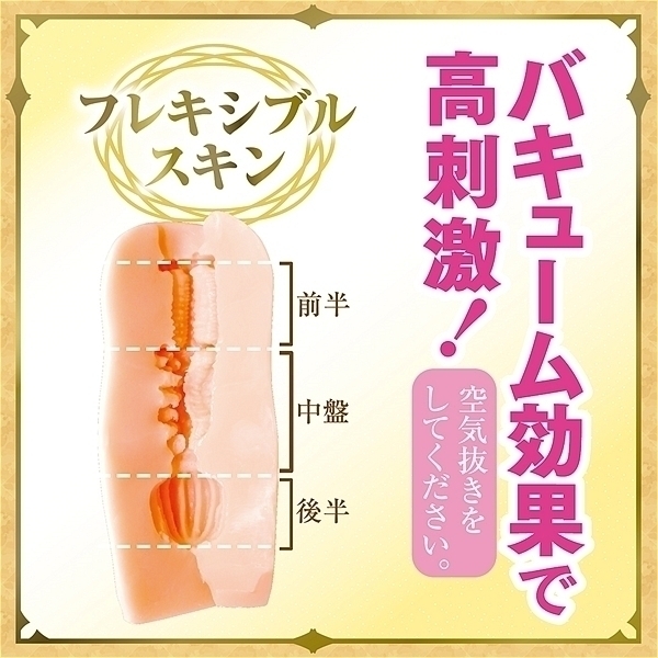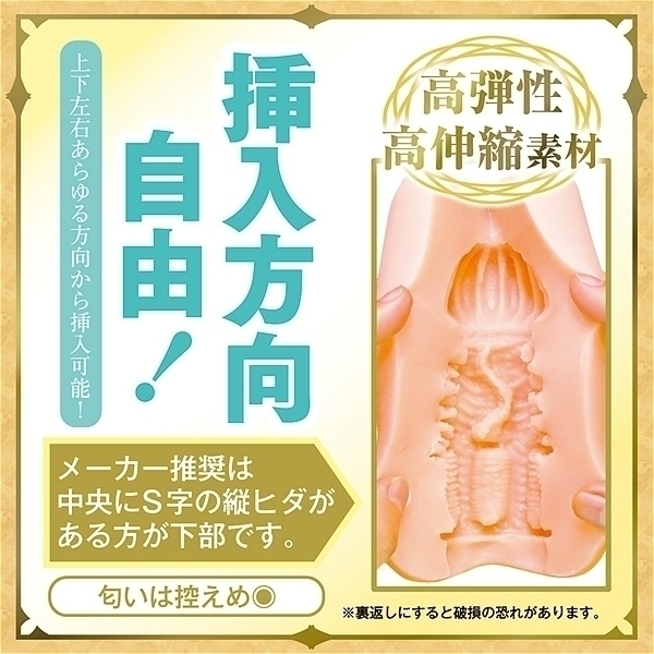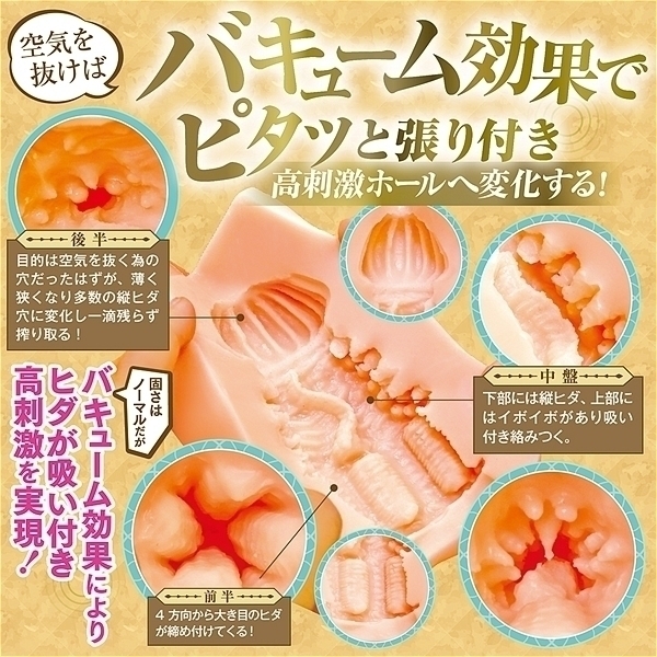 日本製、国内自社工場製。エルフの名器はバキューム特化!4方向から大き目のヒダが締め付けてくる!下部には縦ヒダ、上部にはイボイボがあり吸い付き絡みつく。空気を抜けばバキューム効果でピタッと張り付き感触が変化する!挿入方向自由!左右上下あらゆる方向から使用可能(メーカー推奨は中央にS字の縦ヒダがある方が下部です)。フレキシブルスキン、高弾性・高伸縮素材、匂い控えめ、非貫通型オナホール、ローション付き