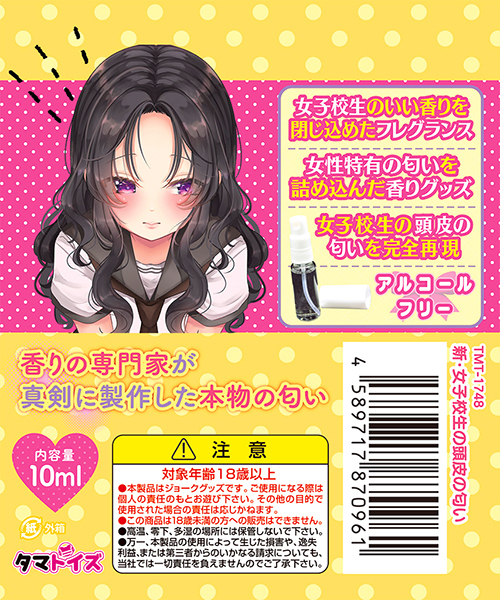女子校生の頭皮の匂いを完全再現。リアルな匂いに大興奮!!女子校生いい香りを閉じ込めたフレグランス、女子校生を抱きしめた時に香る甘い頭皮の匂い、女子校生のフェロモンたっぷりのいい匂い、匂いで感じる新感覚、あのとき感じたあの匂いをもう一度、女性の特有の匂いを詰め込んだ香りグッツ、衣装に匂いのアクセントを。アルコールフリー、香りの専門家が真剣に製作した本物の匂い。●メーカー型番:TMT-1748