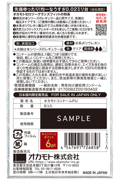 人気シリーズに先端幅広タイプが登場!根元から先端まで均一な薄さ0.02mm台のコンドーム(6個入)。根元は「うすさ均一0.02EX」シリーズのレギュラー品と同じサイズで、先端が幅広サイズになっています。素肌が透けて見える程、透明感のあるクリアカラー!熱が伝わりやすい素材ですので、体温でやわらかくフィットします。ラテックスアレルギーの方でも安心な水系ポリウレタンを使用している為、ゴム特有の臭いもありません。装着時に便利な裏表判別機能がついたコンドームです。