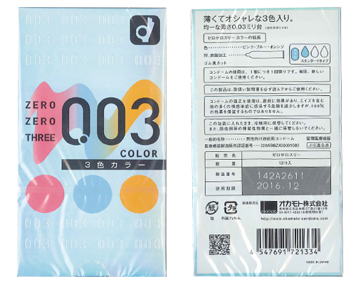 その日の気分で楽しめるピンク、ブルー、オレンジの3色入り!超極うす0.03mmの素肌感覚コンドーム(12個入)。オカモトが追い求め続けてきた「薄さゼロへの挑戦」を遂に実現しました!薄さの限界に挑戦した驚異的なその装着感は、あまりの薄さに着けている感覚を忘れてしまう程。ぬくもり伝わる超至近距離恋愛をぜひ体感して下さい。
