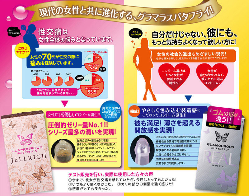 愛し合う二人には必要不可欠!圧倒的な特盛りジェルが嬉しいグラマラスバタフライのコンドーム。●フィット感抜群のラテックス製(スタンダード 8個入り)●ムード感バッチリなオレンジカラー●水溶性ゼリーをとどめる独自開発のジェルトップ加工●たっぷり厚みのあるゼリーで滑らかな挿入感。まるでナマ挿入しているかのような違和感のない着け心地+たっぷりジェルで性交痛のお悩みもサポート!避妊効果はもちろん、性病からも身を守ることができる避妊グッズ。きちんとした方法で装着し、パートナーとのプレイを楽しんでください。※パッケージのリニューアルに伴いデザインが画像と異なる場合が御座いますが同一商品です。