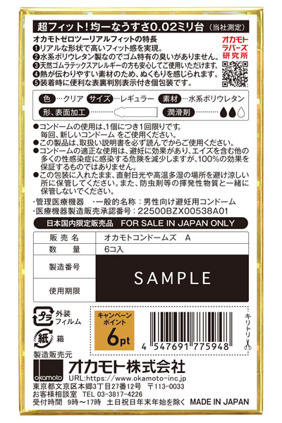二人の愛を繋ぐリアル形状!うすさ均一0.02mm台のポリウレタン製コンドーム(クリア)。●オカモトゼロツー・リアルフィットver(6個入り)●精液溜りをなくし密着感をUP●ラテックスアレルギーの方でも使えるポリウレタン製●ジェルを多めに塗布・挿入をサポート●安心して使える日本製。精液溜りのないリアル形状のポリウレタン製コンドームがオカモト社から発売!お互いの温もりを感じながら、まるでナマ挿入しているかのような快感が味わえる0.02mm台の極薄スキンです。