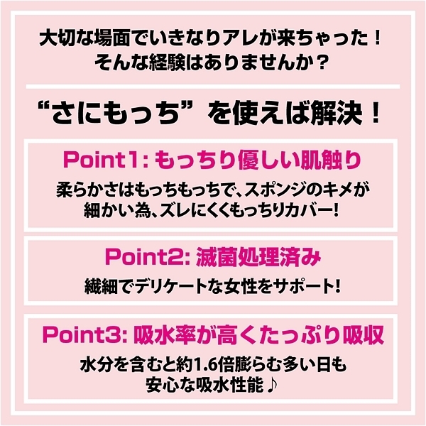 もっちり新素材のサニタリー商品。柔らかくもっちりとした感触の新素材。吸水性が抜群で、水を含むと約1.6倍膨らみます。さにもっちの柔らかさはもっちもっちで、スポンジのキメが細かい為、ズレにくくもっちりカバー。繊細でデリケートな女性をサポート。●もっちり優しい肌触り●滅菌処理済み●吸水率が高くたっぷり吸収材質:ポリウレタン(親水性)※食べ物ではないので口に入れないでください、小さなお子様が誤って口にしないよう注意してください、長時間の利用は雑菌が繁殖する恐れがありますので、入れっぱなしにはしないようご注意ください、取り出しにくい場合はシャワーや精製水で商品本体を膨らませると取り出しやすくなります。