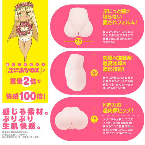 「ぷにあなDX」が進化して、とろける極尻と超重量約5.7kgの「ぷにあなDX極」が登場しました!高弾力の骨盤シリコン内蔵で、安定感抜群のクビレと巨尻を実現し、満足度はMAX♪2層構造の極上ヒップは、揉み心地にもこだわり、内層はトロトロの超やわらか素材で指がズブズブと沈み込むリアルを越えた揉み心地!外層は、弾力性のあるしっかりした素材で、耐久性が高く、強く揉んでも型くずれしにくいです。内部構造も進化しており、2穴それぞれ違う素材で、コリコリはっきり刺激とプニプニとろける快感刺激の多彩なバリエーション刺激を体験できます♪直接肌に触れるものだから、安全性と感触にこだわった高品質なエラストマーを使用しています。パッケージイラスト:maruku