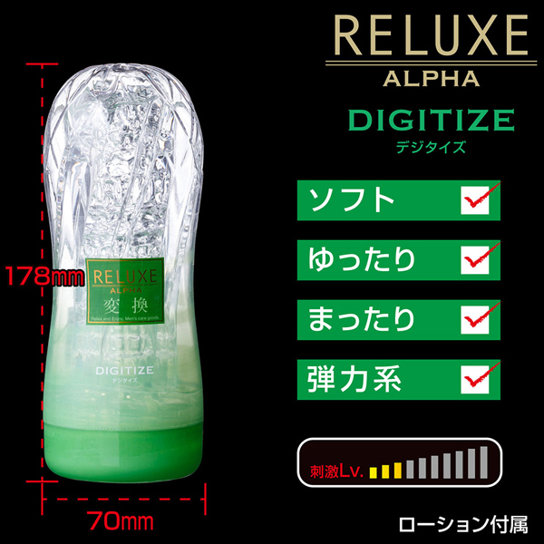 透き通るクリアのボディ、見た目の美しさはもちろん、挿入時に自らのものが透けて見える「reluxe オナホ」。中心部へと集中する縦ヒダが優しく貴方自身を包み込む。このデジタイズは「快楽を変換する魅惑の使用感」。柔らかく包まれる感触と吸引力のバランス、ゆったりとしつつも快適な刺激快楽がじわじわと感度を高めます。また肉厚増量で弾力、バキューム感もUPしています。そしてカップから取り外しての使用も可能、洗浄もできますので何度でも繰り返し使用することが可能です。パッケージカラー:緑