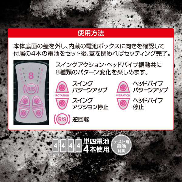 中イキ好きに!6Vの激震でGスポを責め立てる高性能モーター内蔵の電池式バイブ(黒)。8種類の振動&スイングと刺激の変化をもたらすリバース機能など多彩なアクション搭載!挿入可能長153mmのストレートボディが内部をかき回し、ヘッドバイブでGスポを徹底的に刺激する♪止まらぬ快感に病みつきになること間違いなし!滑らかで柔らかな特殊ラバー素材使用。単4電池×4本使用