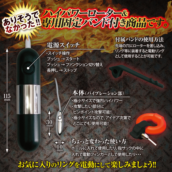 今まで有りそうで無かった!お気に入りのグッズを電動化できる極小ローター&固定バンドのセット。全長3cm、幅1cmと小さいながらも与える振動は強烈!ピンポイントに刺激でき、10段階のアクションを搭載しているため飽きさせません。極小なのでオナホや指サック内部に入れて使ったりなど、アイデア次第では色んな場面でお使いいただけます◎リモコンはワンボタン式