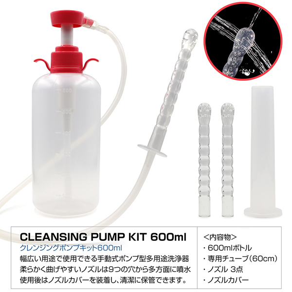 お気に入りオナホを長く使用しませんか?幅広い用途で使用できる手動式ポンプ型多用途洗浄器大型サイズ600ml容量のクレンジングボトルが登場。9つの穴から多方面に噴射!多方面での噴射によって一度の噴射で全体を洗浄することが可能。勢いも分散され安全にやさしく洗浄できます。ノズルは無臭無害の柔らかいPVC素材を採用。注入プレイ等幅広く使用できるマルチポンプキットです。使用後はノズルカバーを装着し清潔に保管できます。