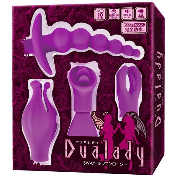 挿れて使う?それとも当てて使う?4種類のアタッチメントが付属し男女でいろんな箇所を刺激することで楽しめる「DUALADY 5WAY(デュアレディ)シリコンローター」。本体はスモールボールヘッドタイプと特徴的で、トータル5wayとマルチスタイルで遊べる高機能なローターとなっています♪本体部分とアタッチメントには高品質なシリコン素材を採用。IPX7等級の高い防水機能に静音仕様を合わせ持ち、時間帯を気にせずお楽しみ頂けます!電源はUSB充電式を採用。90分のフル充電で60分の連続可動が可能!本体先端のボール型部分はクリなどのピンポイント刺激に活用できて、3枚舌のアタッチメントを装着することでクンニのような快感も♪4つの爪のようなアームアタッチメントは乳首をホールドして刺激。ボールが連なったアタッチメントはアナルビーズのような刺激もお楽しみ頂けます♪10パターンの振動と5WAYの使用スタイル!マルチに楽しめるシリコンローターをぜひお楽しみください。