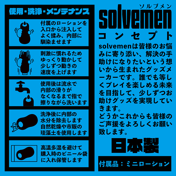 まったりとしたテイストでナカが広めな構造が好きな方のための非貫通型オナホ「とにかくせまい」です。捻れたヒダ構造が特徴のホールで弾力性が高く、ハリがある素材に非貫通らしいきつきつキュウキュウとした挿れ心地を実現!硬すぎず柔らかすぎずでしっかりとした締め付けも味わえる絶妙なバランスの仕上がり♪ねじれヒダと狭さ、これらの刺激が織りなすソルブメンのコンセプト型ホールだから毎日を新鮮な気分でお楽しみ頂けます。素材は安心安全の日本製!繰り返し何度でもご使用頂けます♪