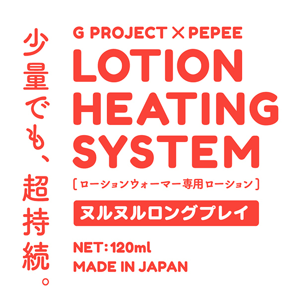 少量でも、超持続。G PROJECT×PEPEEによるLOTION HEATING SYSTEM ローションウォーマー(v02705)で温める専用ローション!より温かく感じるように独自に開発しました!ヌルヌルの感触が心地いい高粘度タイプ。ロングプレイに最適です。片手で簡単!ひねって出せるスライド式キャップを使用しています。直接肌に触れるものだから、安心の国内生産&国産素材。※常温でのご使用も可能です。