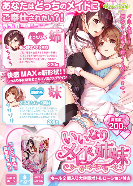 ホール2個入り!大容量ボトルローション付き(姉)もっちりソフト素材。ご主人様をお出迎えする無数の有機ヒダ。あらゆる方向からのさりげない気配りはさすがの大人メイド。優しく包まれて昇天してください。(妹)ぷるるんハード素材。あどけなさとぎこちなさの残る刺激たっぷりのご奉仕。メイドとしても女性としてもまだまだ半人前。ご主人様の愛にあふれたキツめの調教が必要なようです。