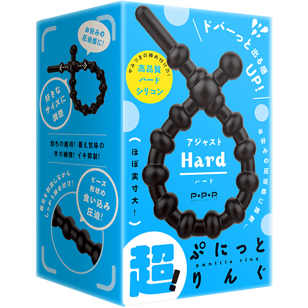 超!ぷにっとりんぐからサイズの調整が出来るアジャストタイプが登場。ストッパーの凹凸も心地よい刺激となって楽しめます!自分のサイズに合わせて、自分好みの締め付けで、サッと装着♪ピタッと密着!ハードverは臭いのない高品質ハードシリコンでやみつきの締め付け!勃ちの維持!萎え気味の竿の補強!イキ抑制!自分サイズに合わせられるので皮戻り防止にも便利です。ドバーっと出る感UPできゅーっと超極楽発射!