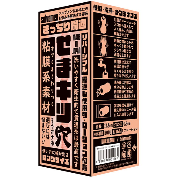 ソルブメンはあなたのお悩みを解決する存在です。「きっちり貫通」は今では珍しい貫通系となっております。洗いやすく衛生的で貫通系は最高です。使い方に幅が出るロングサイズ!キツくまとわりつく粘膜系素材を採用。もうオナホ選びには悩まない!!しかもまさかのリバーシブル仕様。裏返してもお使いになれます。あなたはオナホ選びに悩む必要はなくなります。あなたのためにソルブメンがいるのです。安心安全の日本製で繰り返し何度でも利用が可能です。
