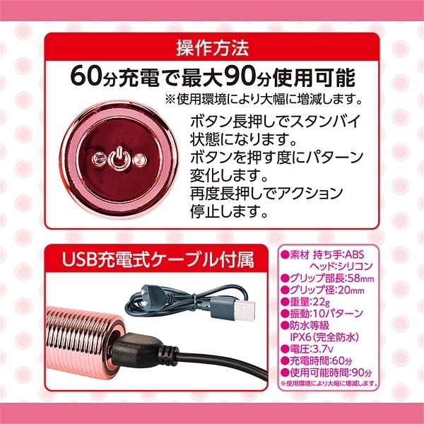 5つのアタッチメントをチェンジして楽しめる5WAYスティックローター。滑らかなシリコンヘッドはローターライクな使い方が楽しめるリップスティックタイプと乳首等を挟んで刺激出来るクラウンタイプ、一点刺激が楽しめるピンポイントタイプ、局部を挟んで刺激する二又タイプ、デンマライクに楽しめるモコモコタイプの5種類。3.7Vのハイパワーリチャーブルバッテリー搭載。60分充電で90分の使用が可能です(使用環境により大幅に増減します)。IPX6の防水性能だからしっかり洗えて水場でも遊べます。振動パターンは10種で色々な振動が楽しめます。